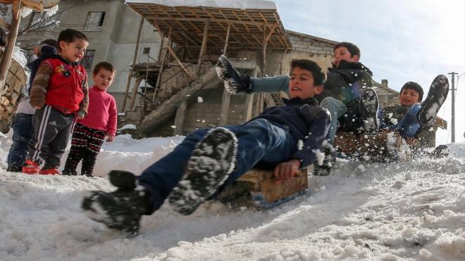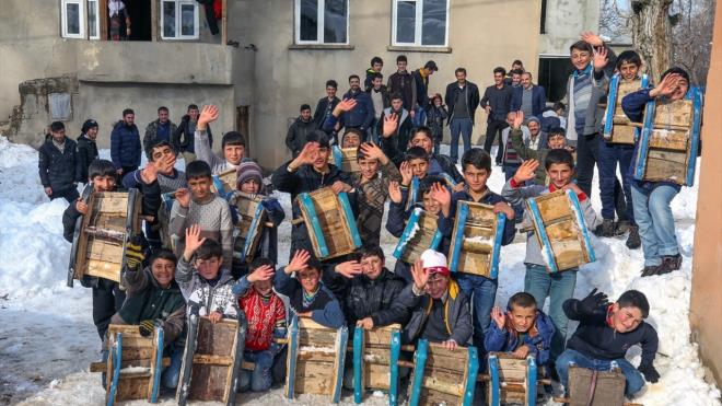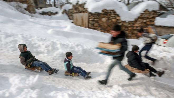 Van'ın Gevaş ilçesinde kar yağışı sonrası etkili olan güneşli havayı fırsata dönüştüren onlarca çocuk, tahta ve plastik borulardan yaptıkları kızaklarla gönüllerince kayak yaptı.