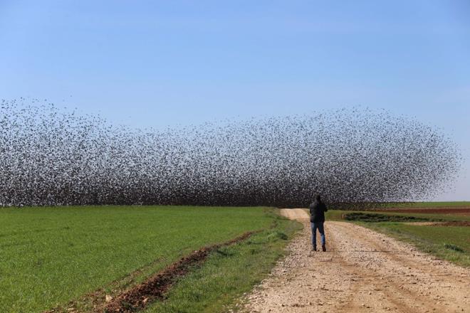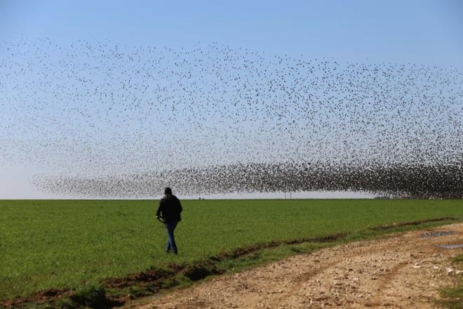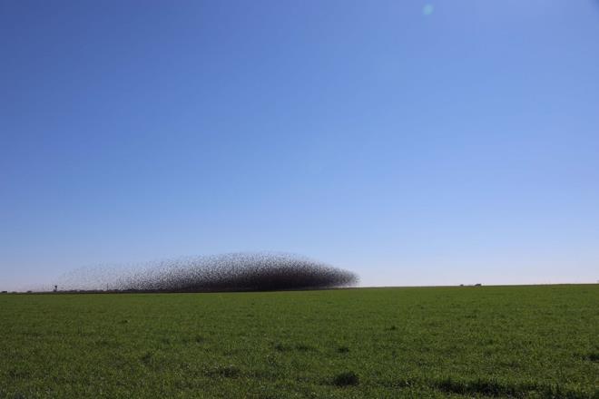 Kuşların oluşturduğu şekiller, zaman zaman ayrılıp tekrar birleşmeleri ve ekimi yapılan tarlalara birden konup kalkmaları ilgiyle izlendi.