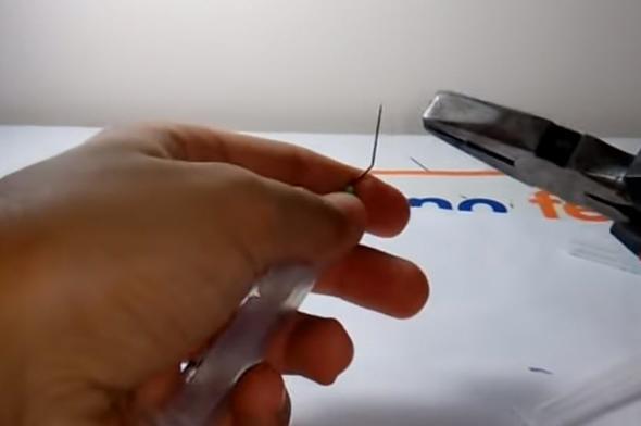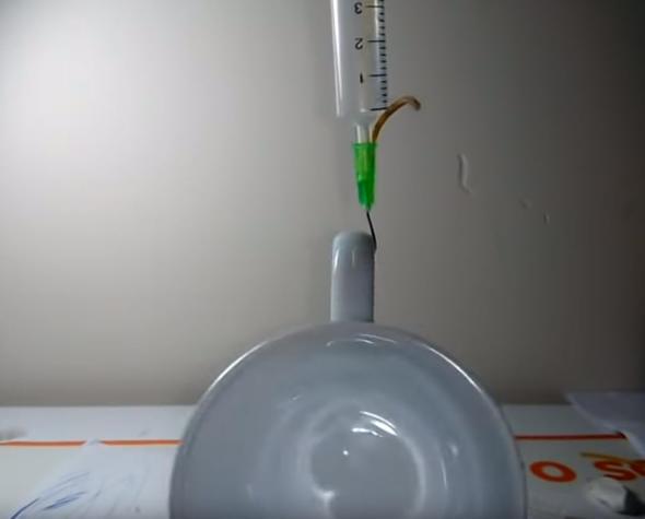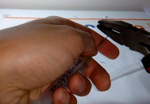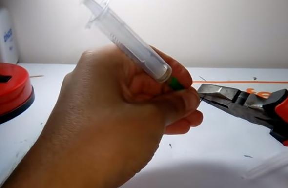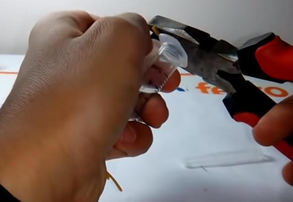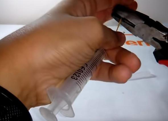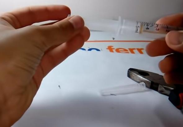 Ardından penseyle şırınganın lastik kısmını çıkarıp attı.
