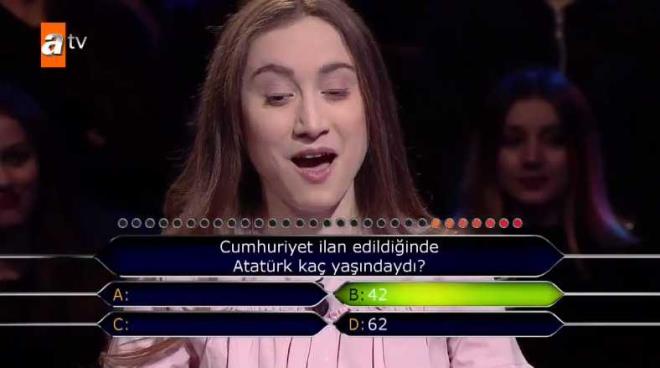 ATV'de yayınlanan Kim Milyoner Olmak İster programınının dün akşamki bölümünde herkesin şaşkına uğratan anlar yaşandı. Yarışmada sorulan "Cumhuriyet ilan edildiğinde Atatürk kaç yaşındaydı?" sorusu 20 yaşındaki gazetecilik bölümü öğrencisi yarışmacıya zor anlar yaşattı.