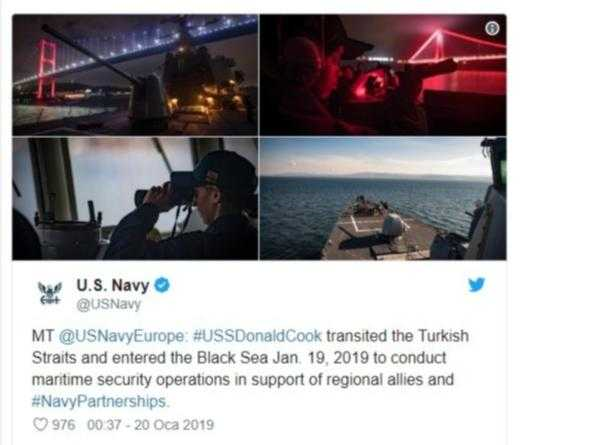 "TÜRK BOĞAZLARINI GEÇTİ" Donanma'nın kapak resmi olarak kullandığı fotoğrafın 19 Ocak'ta çekildiği biliniyor. Aynı gün fotoğraflar ile paylaşım yapan donanma, "USS Donald Cook, deniz güvenliği operasyonlarında bölgesel müttefiklere yardım etmek için Türk Boğazlarını geçti ve Karadeniz'e girdi." notunu düşmüştü.