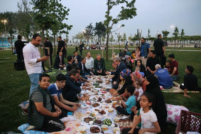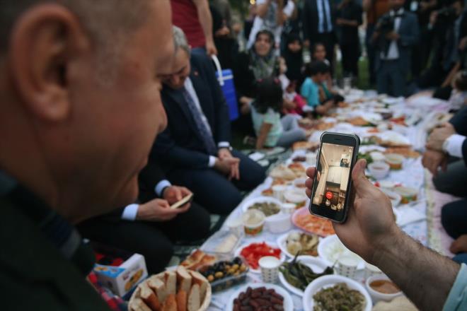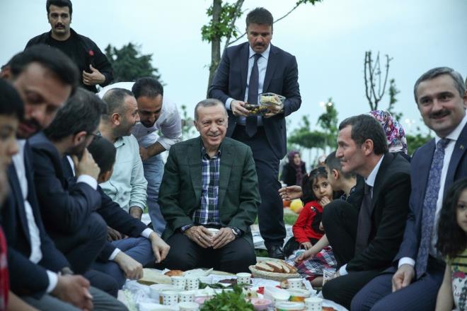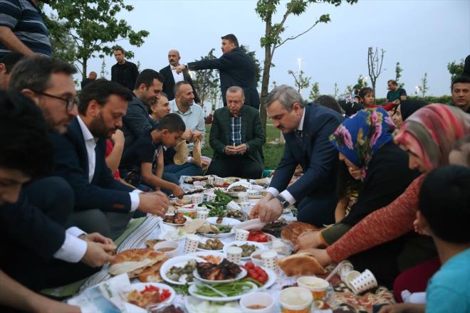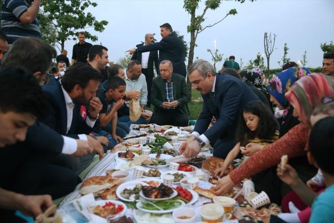 Erdoğan, bir ailenin çimenlik alana kurduğu yer sofrasına konuk olarak onlarla orucunu açtı.
