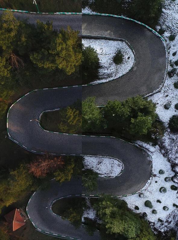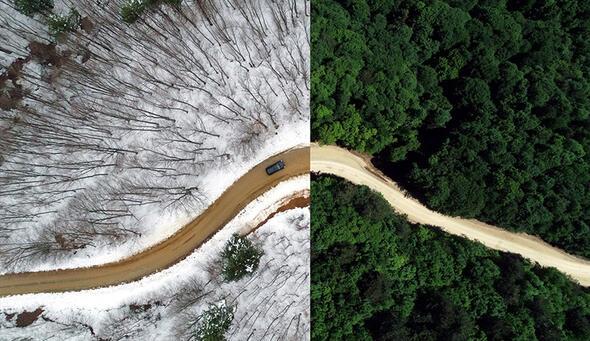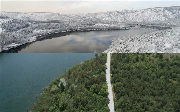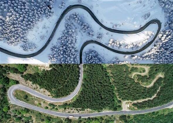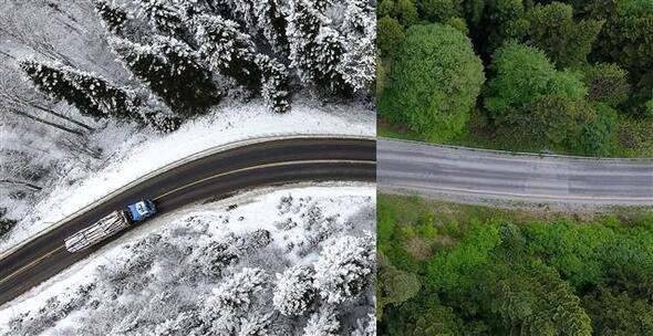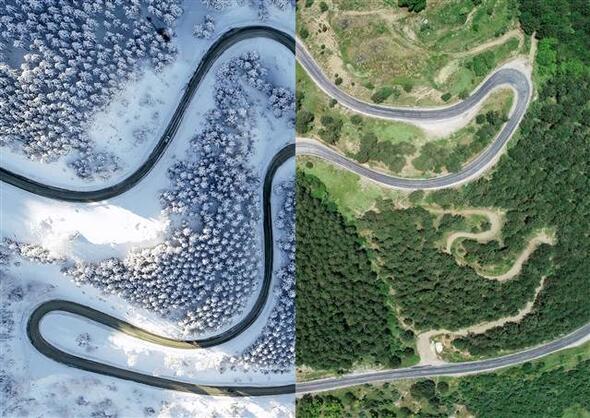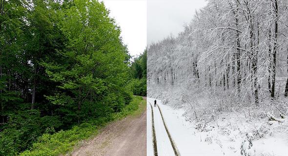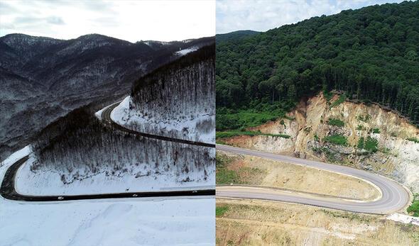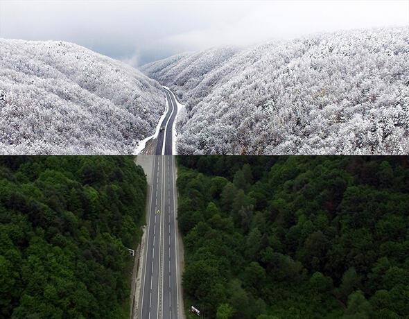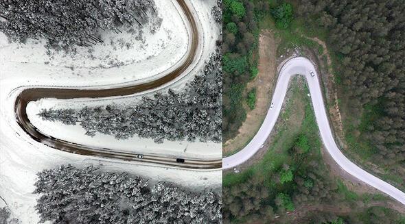 Bir yarısı kar, diğer yarısı yemyeşil bahar ve yaz manzaralarından oluşan fotoğraflarda Türkiye'nin doğusundan batısına, kuzeyinden güneyine özellikle orman ve yollardaki mevsimsel değişiklikler göze çarpıyor.