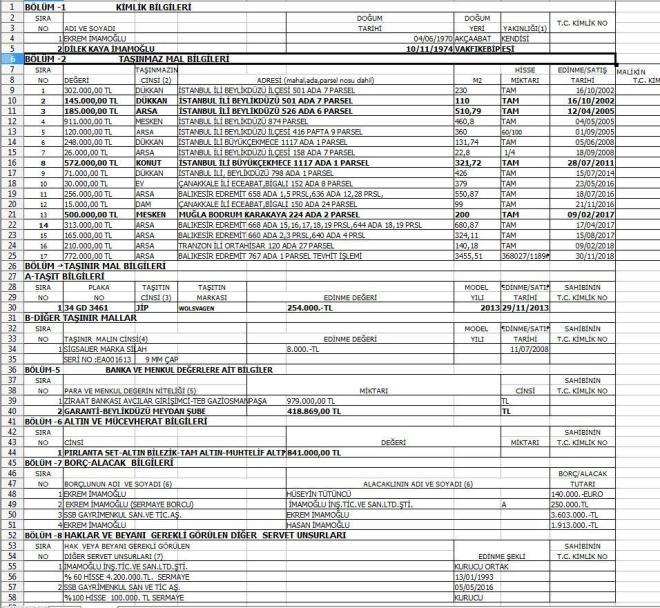 İBB seçimini büyük bir zaferle önde bitiren Ekrem İmamoğlu, rakibi AK Parti'nin adayı Binali Yıldırım ile katıldığı FOX TV'deki ortak canlı yayında kendisine ve ailesine ait malvarlığını açıklayacağını söylemişti. Bugün basın biriminden Ekrem İmamoğlu ile birlikte eşi Dilek İmamoğlu ve babası Hasan İmamoğlu'nun mal varlığı listesi geldi.