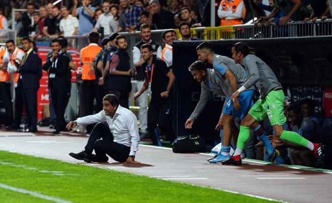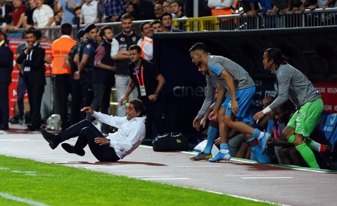 Mücadelenin 80. dakikasında kulübeye doğru havadan yönelen topu eliyle yakalamak isteyen Trabzsonspor Teknik Direktörü Ünal Karaman, bir an dengesini kaybetti ve kendini yerde buldu.