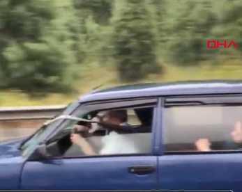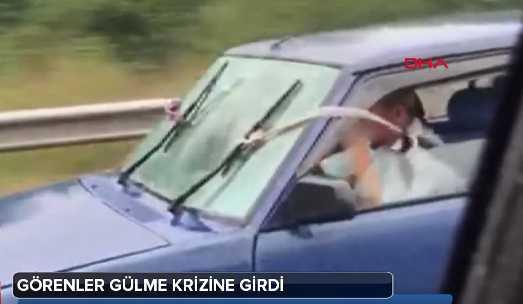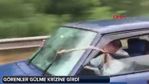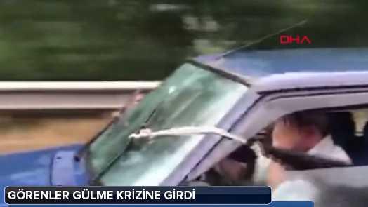 Görüntülerde yağmur altında hızla ilerleyen otomobilin bozuk sileceklerinin arka koltukta oturanlar tarafından iple çekilerek kontrol edildiği görülüyor.