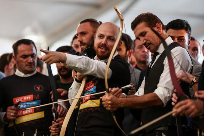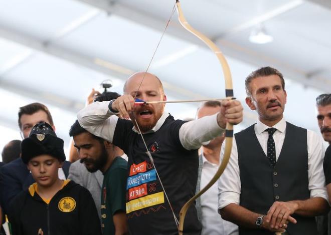 Dünya Etnospor Federasyonu Başkanı Bilal Erdoğan Falcao ve Vedat Muriqi'ye ok atma konusunda yardımcı oldu.