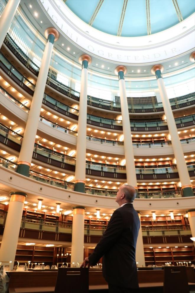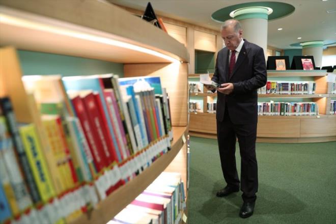 Cumhurbaşkanı Recep Tayyip Erdoğan, Cumhurbaşkanlığı Külliyesi'nde yapılan kütüphanede incelemelerde bulundu.