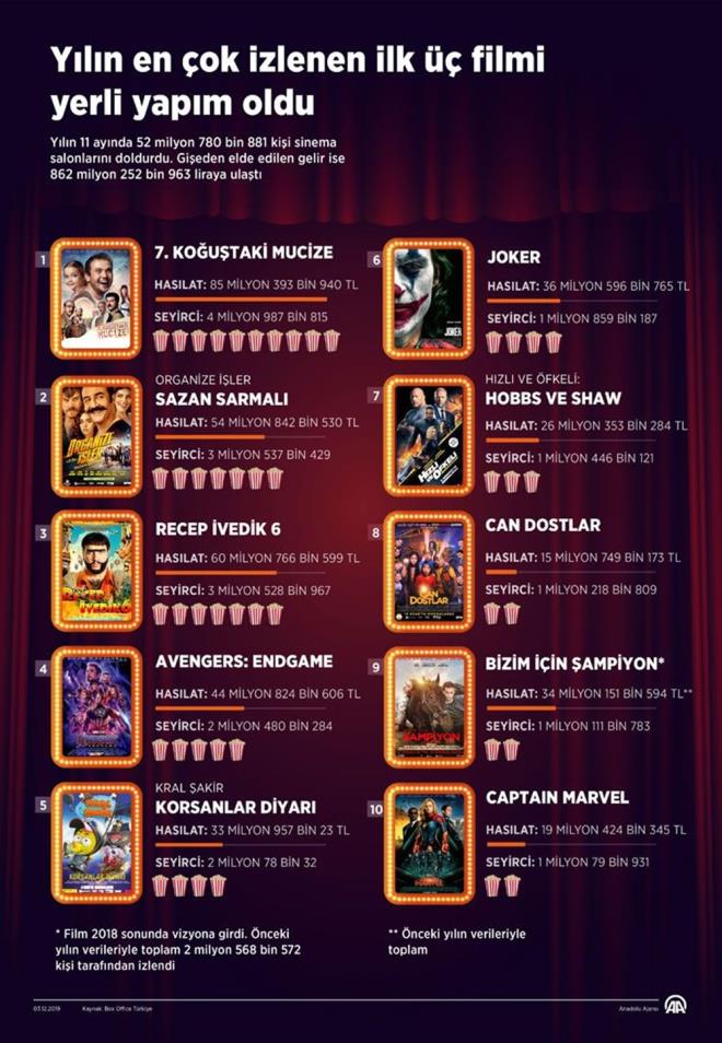 Aras Bulut İynemli, Nisa Sofiya Aksongur, Celile Toyon, İlker Aksum, Mesut Akusta, Deniz Baysal, Yurdaer Okur ve Sarp Akkaya'nın rol aldığı "7. Koğuştaki Mucize", 4 milyon 987 bin 815 izleyiciye ulaşarak, yılın en çok izlenen filmi oldu.