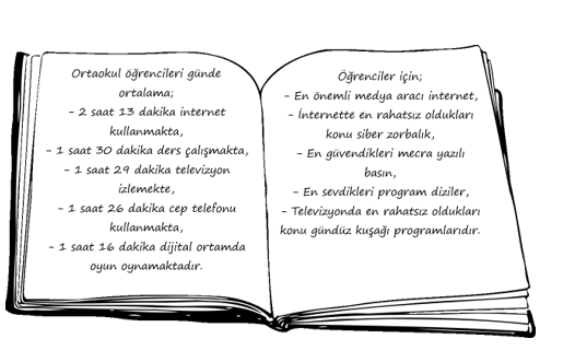Öğrencilerin %59,6?sının internete bağlandığında tek başına olduğu ve yüzde 44,2?sinin hoşlanmadıkları kişi veya içerikle yani siber zorbalıkla karşılaşması da araştırmanın önemli bulguları arasında yer aldı. Her 4 öğrenciden 1?inin internette hoşlanmadığı bir durumla karşılaştığında bunu hiç kimseyle paylaşmadığı görüldü. İşte dev araştırmanın çarpıcı sonuçları: