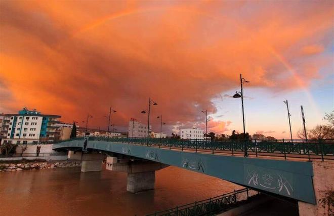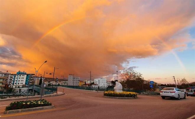 Güneşin gökyüzündeki bulutların arkasına geçmesi ile oluşan turuncu hava ve ortaya çıkan gökkuşağı, bölge halkına görsel bir şölen sundu.