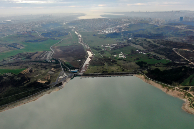 İstanbul için hayati öneme sahip olan Kanal İstanbul Projesinin yapılacağı olan Küçükçekmece gölü ile Sazlıdere Barajı'nın havadan çekilen görüntülerinde güzergah üzerinden Sazlıdere?nin kepçeler tarafından balçıktan temizlendiği görülüyor.