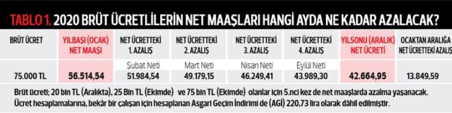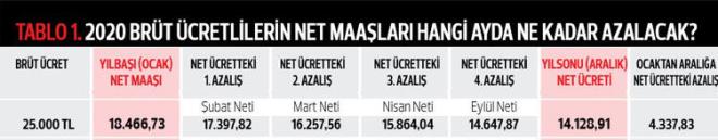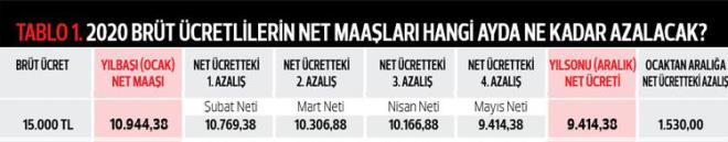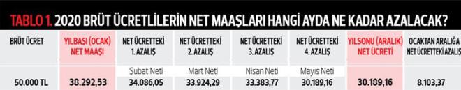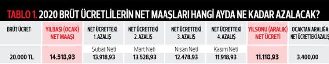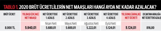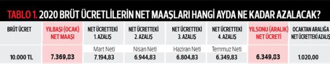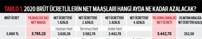 Brüt ücreti 5 bin lira olan çalışan üzerinden örneklendirelim: 2020’de brüt ücreti 5 bin lira olan bir çalışan; ocak ayında banka hesabına 3 bin 795 lira net maaş yattığını görecek. Haziranda ise net maaşının 3 bin 620 liraya düştüğünü görecek. Temmuzda 3 bin 582 lirayı ve kalan beş ayda ise 3 bin 442 lirayı net maaş olarak hesabında görebilecek. Ocak ayına göre, aralık ayında net maaşında 352 lira azalma yaşanacak. Azalmanın nedeni, maaştan kesilen gelir vergisi. Farklı brüt ücretli çalışanlar için de; net maaşın hangi ayda ne kadar azalacağı Tablo 1’den görülebilir.