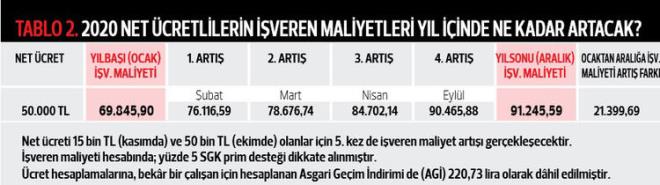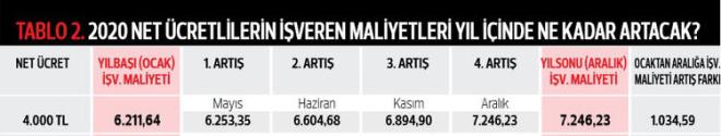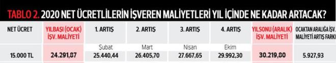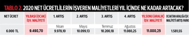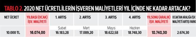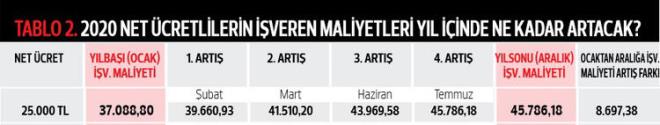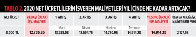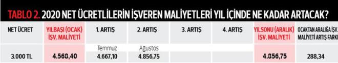 Çoğu işyerinde çalışanların net ücreti aydan aya değişmez. Aynı net ücret üzerinden her ay bordro hesaplamaları yapılır. Net ücretlilerin her ay aynı net ücreti alabilmesi için artan vergi yükü işveren tarafından üstlenilir. Dolayısıyla işverenin ocak ayındaki işveren maliyeti ile sonraki aylarda işveren maliyeti aynı olmaz. Aydan aya artar. Net ücrete sahip çalışanlar için ilerleyen aylarda işveren maliyetinin ne kadar artacağı Tablo 2’den görülebilir. -
