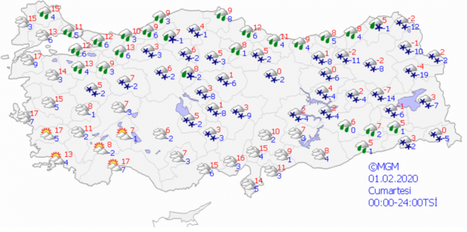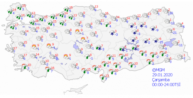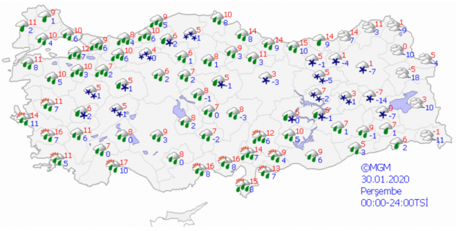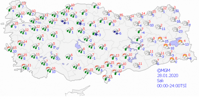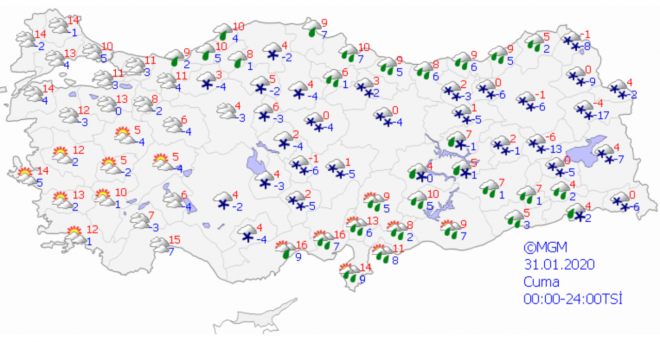 Yurdun kuzey, iç ve batı kesimlerinin parçalı ve çok bulutlu, Marmara, Ege, Batı Akdeniz kıyıları ile Eskişehir, Bolu ve Düzce çevrelerinin yağmur ve sağanak yağışlı, diğer yerlerin az bulutlu geçeceği tahmin ediliyor.