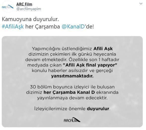 Burcu Özberk ve Çağlar Ertuğrul’un başrollerinde yer aldığı Afili Aşk dizisinin yapımcı firması ARC Film, yaptığı duyuruda final iddialarının asılsız olduğunu belirtti.