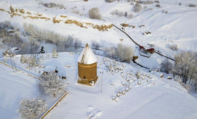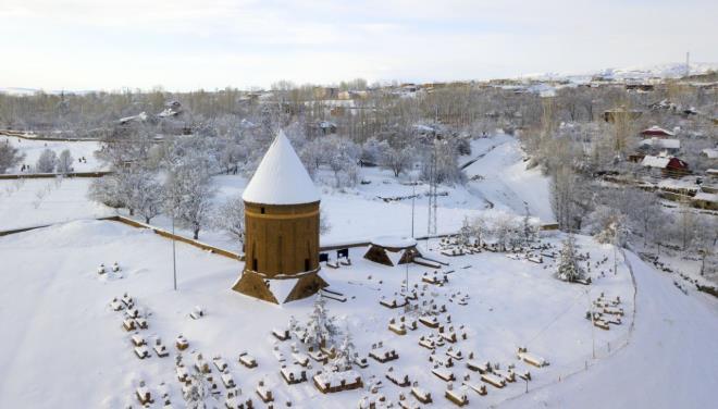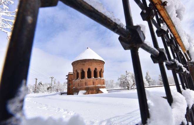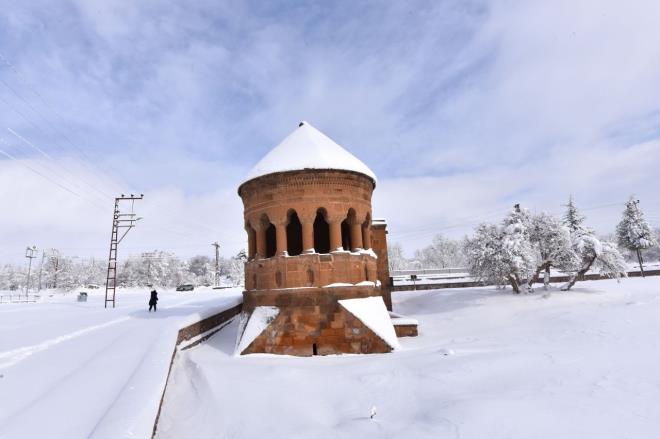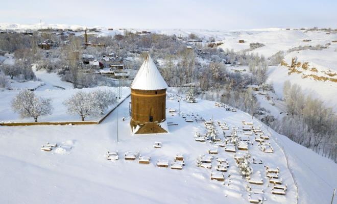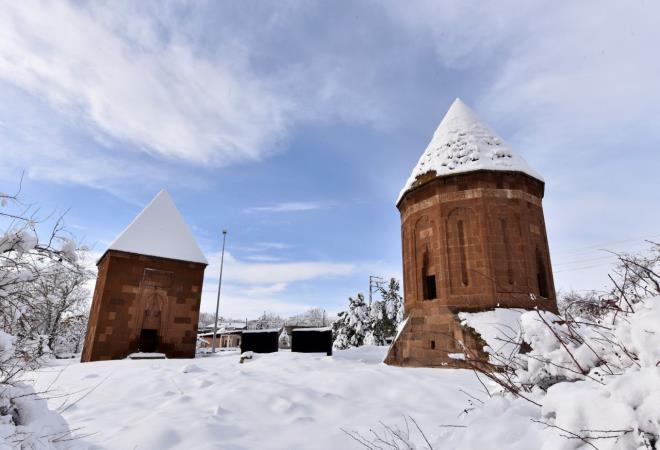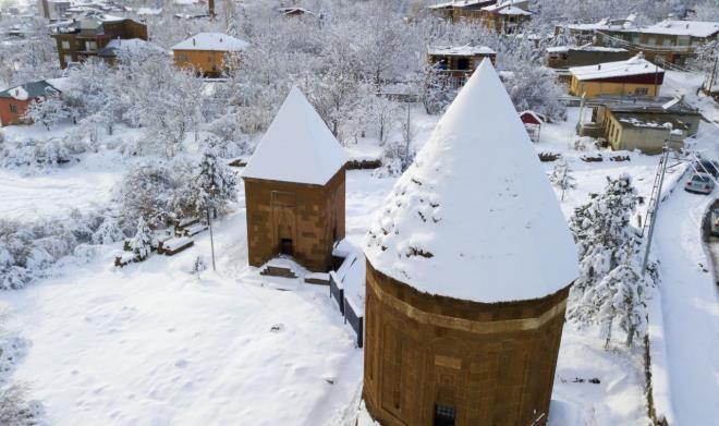 Bitlis’in Ahlat ilçesindeki tarihi yapıların karla bütünleşmesi, seyrine doyumsuz manzaralar oluşturuyor.