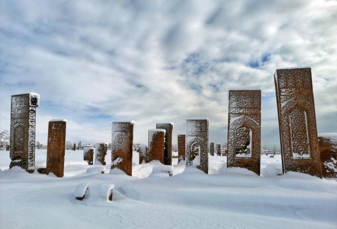 Anadolu’nun Orhun Abideleri olarak da adlandırılan 210 dönümde kurulu Ahlat Selçuklu Meydan Mezarlığındaki mezar taşlarının üzerindeki yazılar; kabartmalar, nakış ve işlemeler, kar yağışı sonrası ziyaretçilerini hayran bırakan bir güzelliğe bürünüyor.