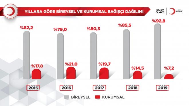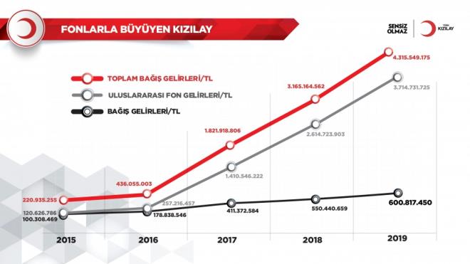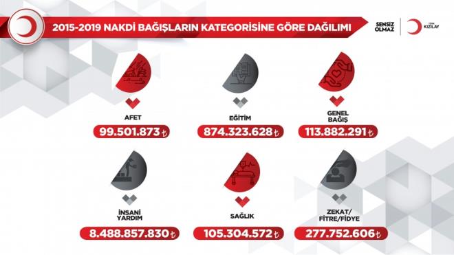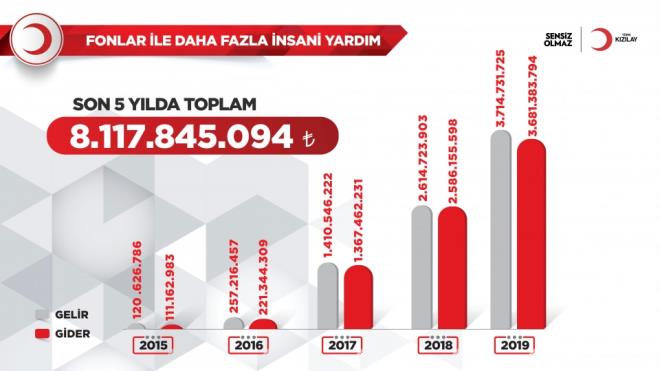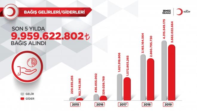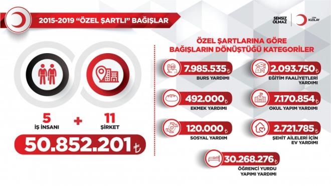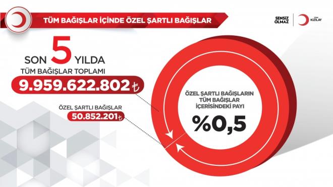 Kızılay Genel Başkanı Kerem Kınık, Kızılay'a 2015'ten 2019'a kadar geçen sürede sadece 5 iş insanı ve 11 şirketin 'özel şart' öne sürerek 50 milyon 852 bin TL bağış yaptığını söyledi. Kınık, "10 milyar TL'nin içerisinde özel şartlı yardımların oranı sadece binde 5'tir" dedi.