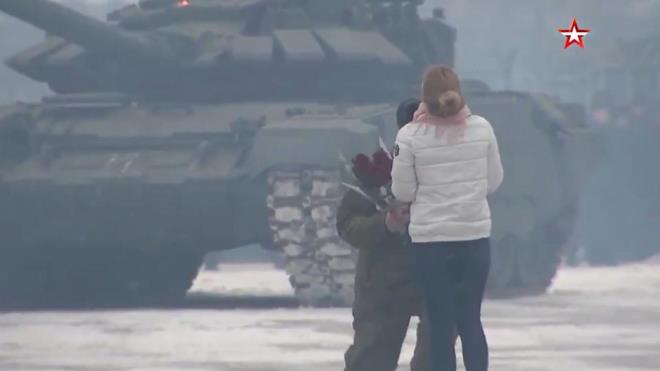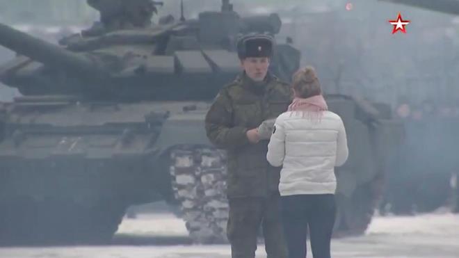 Rus asker, Moskova bölgesindeki kırsal bir kesimde yer alan Alabino poligonunda 16 adet T-72B3 tankıyla oluşturulan kalp şeklinin ortasına kız arkadaşıyla birlikte yürüdü. Daha sonra genç, kalbin ortasında kız arkadaşının önünde diz çökerek evlilik teklifi etti. Genç kadının ise evlilik teklifini kabul ettiği belirtildi.