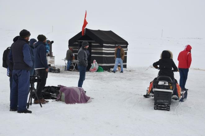 Buz tutan göl üzerinde köylü gençlerin Kars turizmine katkı sağlamak adına kurdukları kıl çaldıra gelen vatandaşlara kuşburnu ve çay ikram ediliyor.