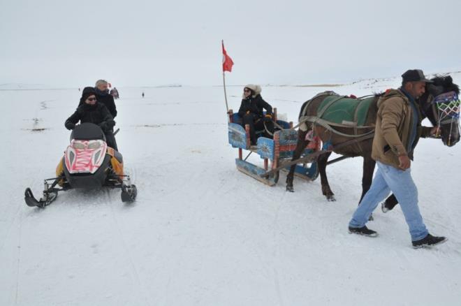 Ardından vatandaşlar göl üzerinde hazır bekleyen atlı kızak ve kar motorlarıyla buz üzerinde gezdirilerek, vatandaşlara unutulmaz anlar yaşatılıyor.