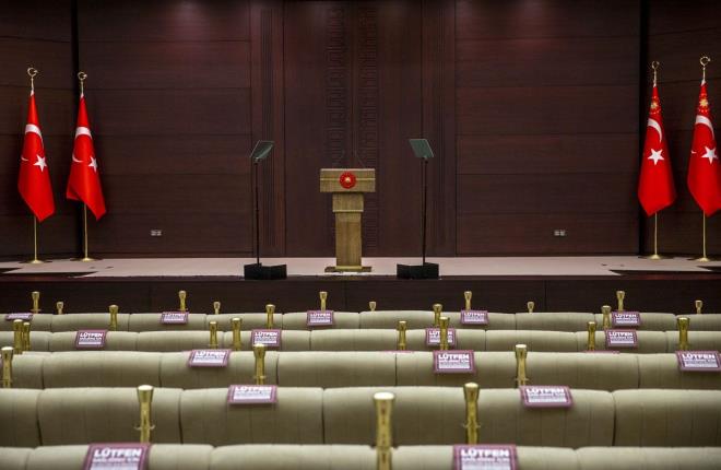 Cumhurbaşkanı Erdoğan'ın, Çankaya Köşkü'nde düzenlenen Koronavirüsle Mücadele Eşgüdüm Toplantısı sonrası açıklama yapacağı basın toplantı salonunda yeni tip koranavirüs (Covid-19) önlemleri alındı.