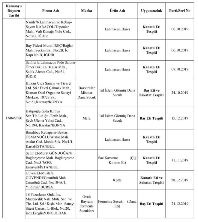 Bitkisel yağlara da farklı tohum yağları katıldığı anlaşılırken, denetimler sonucu, kırmızı et ve et ürünlerinde at eti, kanatlı eti, sakatat ve baş eti tespit edildi.