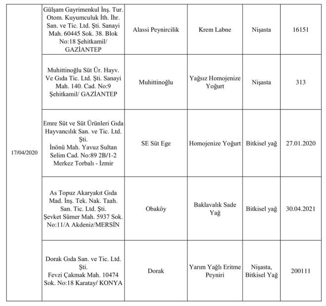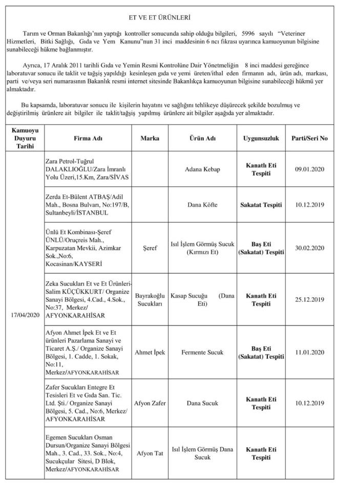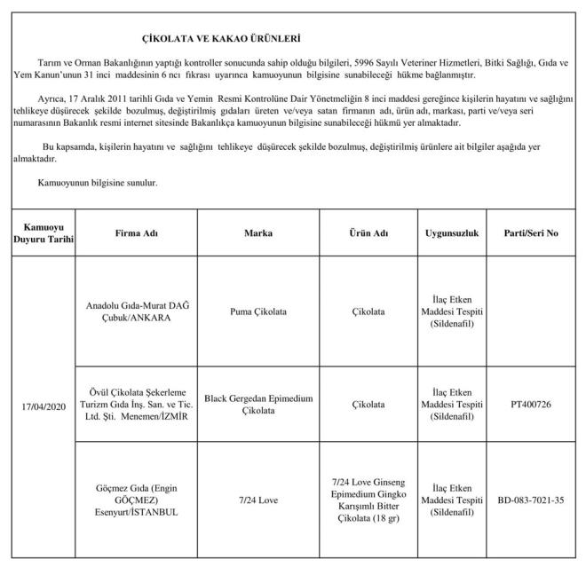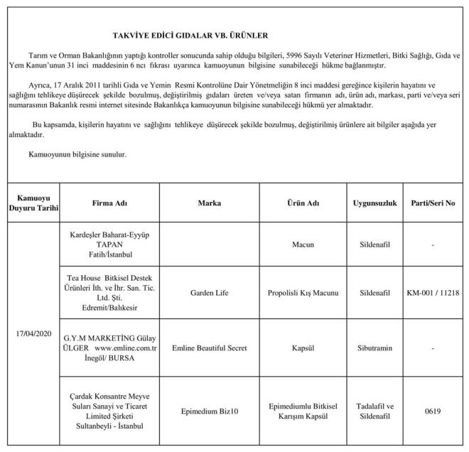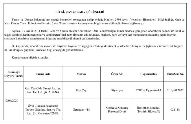 Duyuruda, alkolsüz içecekler, arıcılık ürünleri, baharat, bitki, çay ve kahve, bitkisel yağ, çikolata ve kakao ürünleri, enerji içecekleri, et ve et ürünleri, süt ve süt ürünleri ile takviye edici gıdalarda taklit-tağşiş yapıldığı veya ilaç etken maddesi ilave edildiği belirlenen ürünlerin listesine yer verildi. Listede, firma adı, marka, ürün adı, uygunsuzluk nedeni ve parti numaraları sıralandı.