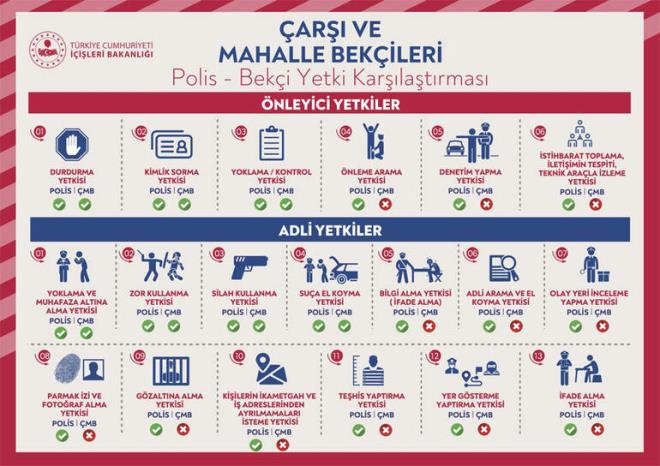 İçişleri Bakanlığı, sosyal medya hesabından bekçilerle polislerin yetkileri arasındaki farkı gösteren bir tablo paylaştı.