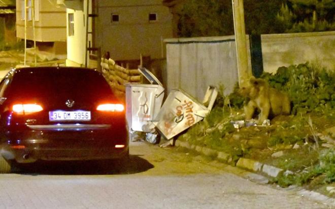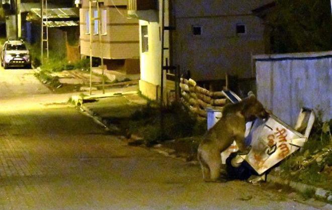 Bir süre çöp konteynerinin yanında karnını doyuran boz ayı, ardından ormanlık alana gitti.