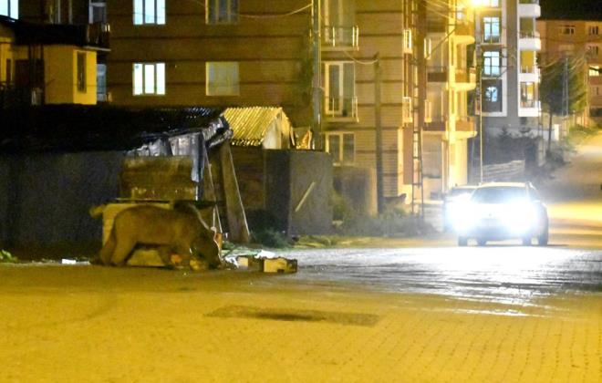 Kars'ın Sarıkamış ilçesinde bir boz ayı, yiyecek arayışı için mahalleye indi.