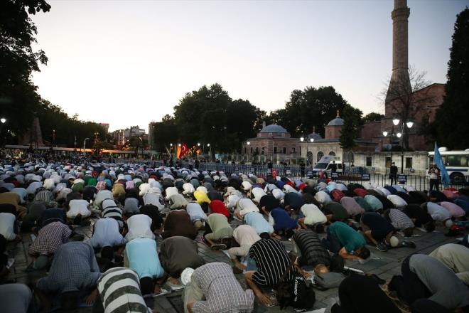 Danıştayın Ayasofya'nın camiden müzeye dönüştürülmesine dair 24 Kasım 1934 tarihli Bakanlar Kurulu kararını iptal etmesi sonrasında Ayasofya Meydanı'na gelen bir grup vatandaş burada akşam namazı kıldı.