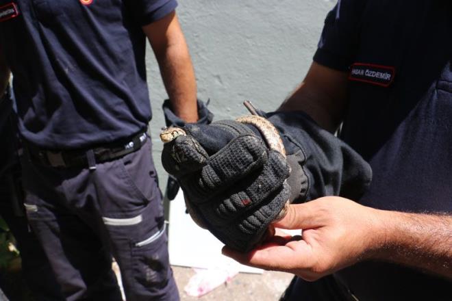 Eve gelen yaşlı kadının oğulları da yılanı çıkaramayınca durumu itfaiye ekiplerine haber verdi. İhbar üzerine olay yerine gelen itfaiye ekipleri, yılanın makinenin içine saklanması nedeniyle uzun süre yılanı çıkaramadı.