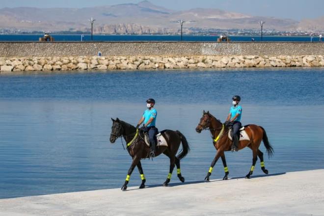 Yeni tip koronavirüs (Kovid-19) tedbirleri kapsamında vatandaşları sosyal mesafe konusunda da uyaran atlı jandarmalar, motorlu araçların giremediği Van Gölü'nün sahil bandı boyunca halkın huzur ve güvenliğinin sağlanması amacıyla devriye geziyor.