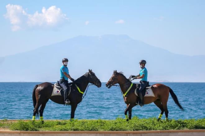 Atlı birlik, havaların ısınmasıyla oluşan yoğunluğun ardından sahil bandı boyunca devriye gezerek bölgenin güvenliğini sağlamak için görev yapıyor.