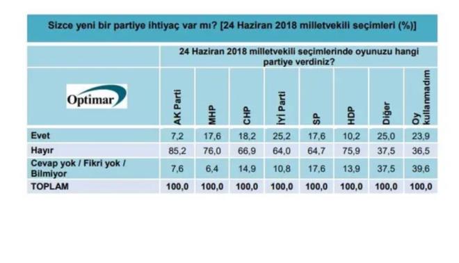 Optimar Araştırma Şirketi'nin ağustos ayı anketi yayımlandı. Ankette "Sizce yeni bir partiye ihtiyaç var mı?" sorusuna, ankete katılanların yüzde 14.7'si 'Evet' yanıtını verirken, yüzde 70.8'i 'Hayır' yanıtını verdi. 'Fikrim yok' diyenlerin oranı ise yüzde 14.5.