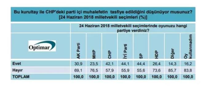 PARTİ İÇİ MUHALEFETİN DURUMU Bir diğer soruda, CHP'nin parti içi muhalefeti gündeme getirildi. "Bu kurultay ile CHP'deki parti içi muhalefetin tasfiye edildiğini düşünüyor musunuz?" sorusuna, katılımcıların yüzde 31.2'si 'Evet', yüzde 68.8'i 'Hayır' yanıtını verdi.