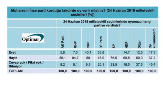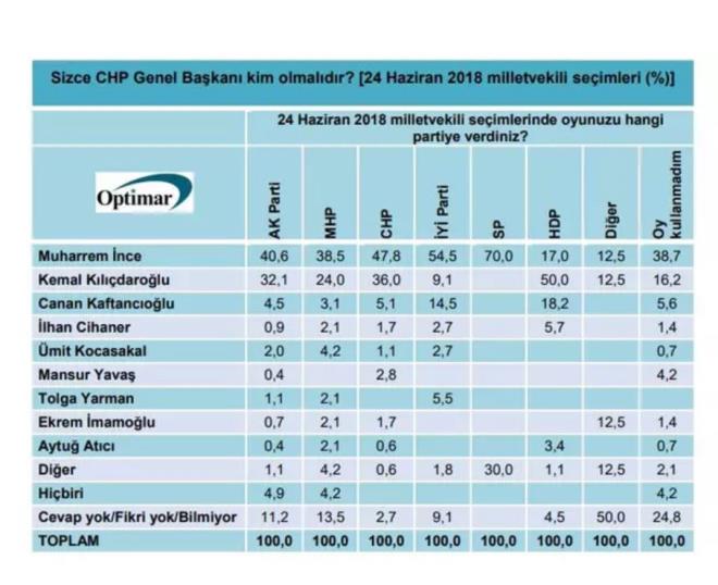 Optimar'ın ağustos ayı anketi yayımlandı. Ankette Muharrem İnce yeni parti kurarsa oy veririm diyenlerin oranı yüzde 17.1'ken, hayır diyenlerin oranının yüzde 66.9 olduğu görüldü. "CHP Genel Başkanı kim olmalı?" sorusuna verilen yanıtlar da dikkat çekti.