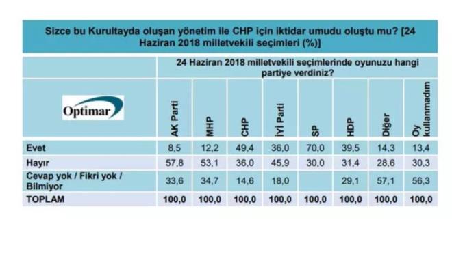 KURULTAYDA CHP İÇİN İKTİDAR UMUDU OLUŞTU MU? "Sizce bu Kurultayda oluşan yönetim ile CHP için iktidar umudu oluştu mu?" sorusuna, katılımcıların yüzde 22.2'si 'Evet' derken, yüzde 46.3 'Hayır' yanıtını verdi.