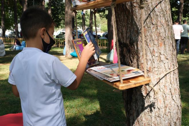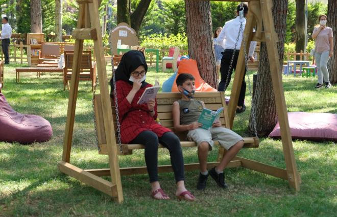 Oturma düzeninin sosyal mesafe kuralına göre oluşturulduğu, puf, minder, sandalye, salıncak ve oturma grupları ile donatılan bu alanda kitapseverler ister içinde 4 bin kitap bulunan gezici kütüphaneden, isterlerse de ücretsiz wifi hizmeti ile 22 bin elektronik kitaptan yararlanabilecek. Ağaçlar arasında tamamen doğal ortamda verilen kütüphane hizmetinde küçük okurlar da unutulmadı. Boyama ve el becerileri gibi atölye çalışmalarıyla küçük okurlar da Açık Hava Kütüphanesi’nden gönüllerince yararlanabiliyor. -