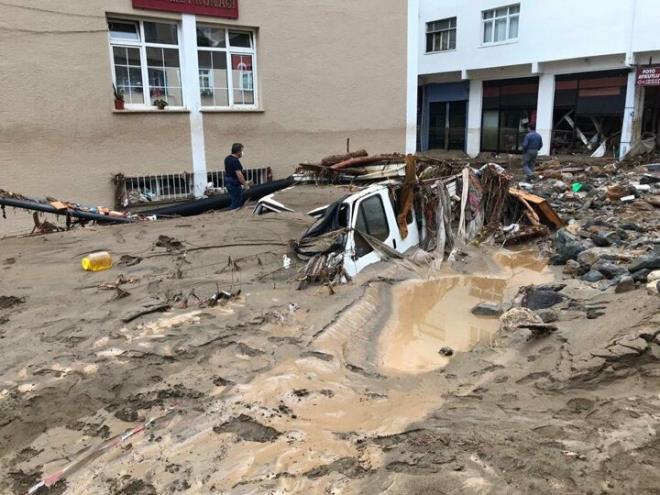 Giresun'un Dereli ilçesinde şiddetli yağış etkili oldu. Yağışın ardından ilçe merkezinde derenin taşmasının ardından çok sayıda iş yeri hasar gördü.