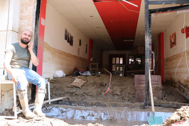 Giresun'da sel nedeniyle su baskını yaşanan Dereli ilçesinde hafriyat kaldırma çalışması yapılıyor. Ekipler caddeler, kamu binaları ve iş yerlerindeki çamur ve kumları temizliyor.