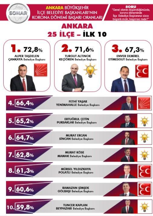 Ünlü anket şirketi SONAR Araştırma, Büyükşehir olmayan il belediye başkanları ve İstanbul dışındaki ilçelerde koronavirüs pandemisi döneminde başarılı olan belediye başkanları anketini yayınladı. Anketten dikkat çeken sonuçlar çıktı.