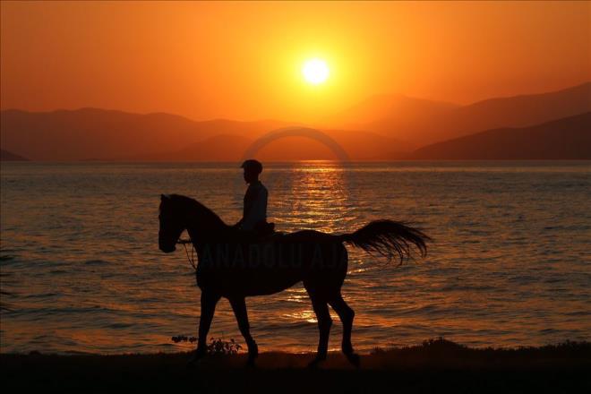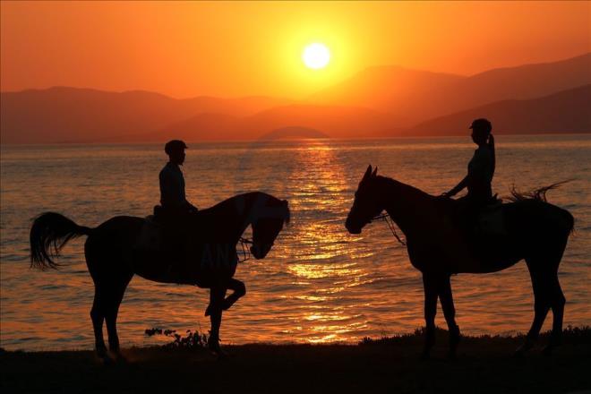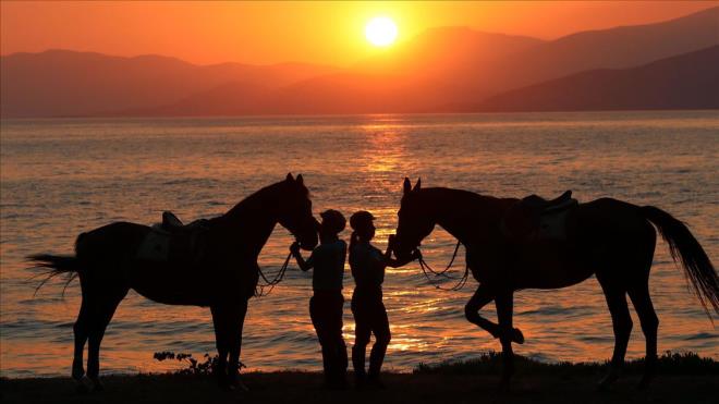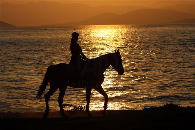 Aydın'ın Kuşadası ilçesindeki Dilek Yarımadası Büyük Menderes Deltası Milli Parkı'nda gün batımı güzel görüntü oluşturdu. Milli parktaki Kavaklı Jandarma Karakolunda görevli Jandarma At ve Köpek Eğitim Merkez Komutanlığına bağlı atlı jandarma timi gün batımında devriye faaliyeti gerçekleştirdi.