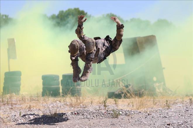 İkinci adımda ise akrobatik hareketlerle hedeften çıkan polisler, düşman unsurunun etkisiz hale getirilmesini canlandırdı. Bir polis memuru koşarak geldiği hedefe, takla atıp yan dönüşler ile tabanca ve uzun namlulu tüfekle atış yaptı. Keskin nişancı timinin de yer aldığı eğitimde, 1500 metre menzilli tüfek ile 500 metre uzaklıktaki hedefler vuruldu. Şişirilen 3 balonu 3 atışta vuran keskin nişancı da özel kıyafeti sayesinde kamufle olmayı başardı.