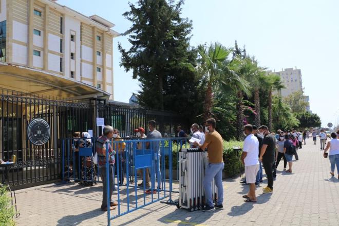 Antalya'da corona virüs (Covid-19) salgınıyla mücadele kapsamında kamu kurum ve kuruluşlarına HES kodu ile giriş zorunluluğu getirilmesi sonrası, adliye önünde kuyruk oluştu.