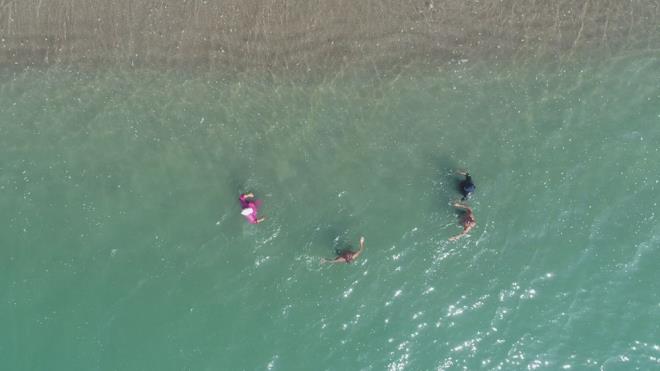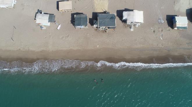 Oba ve çardakların son hali ve denizde yüzen kişiler drone ile havadan da görüntülendi.