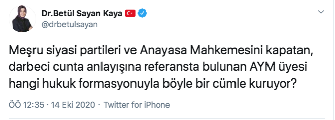 AK Parti Grup Başkanvekili İstanbul Milletvekili Mehmet Muş da AYM üyesine şu twiti attı: -Anayasa Mahkemesi üyesinin tehdit iması içeren "AYM'nin ışıkları yanıyor" sözlerini kınıyoruz. Hiçbir kurum yada kişi milli iradeye gözdağı veremez. Jüristokrasi heveslilerine bu millet fırsat vermez!