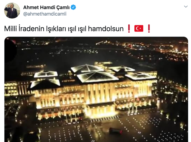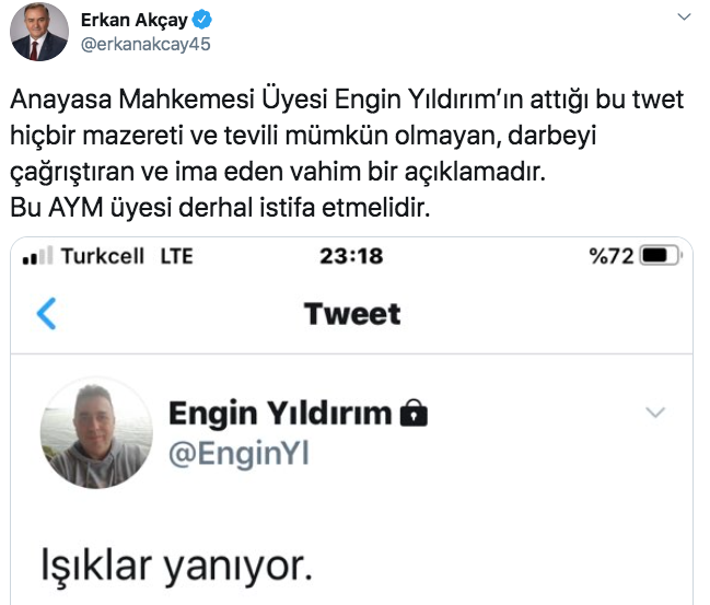 Engin Yıldım Anayasa Mahkemesi'nin fotoğrafını paylaşarak 'Işıklar yanıyor' yazdı. 'Darbe mesajı' veriyor denilen twite ilk cevap İçişleri Bakanlığı resmi twitter hesabından geldi. Bakanlık hesabından yapılan paylaşımda "Işıklarımız hiç sönmüyor' denildi.